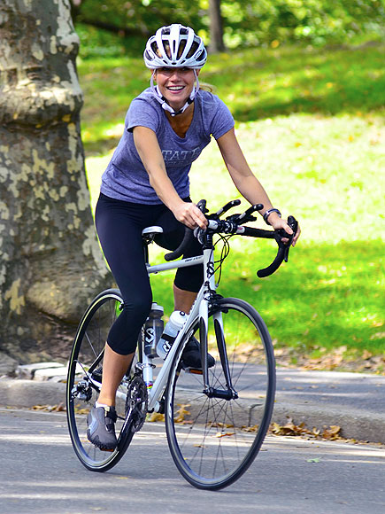 Take Kate Bosworth, looking very Warhol's Factory and Edie Sedgwick. Keira Knightley's sleeveless blouse, cropped trousers and deck shoes vibe. Famke Janssen exercising her dog, Liquorice,on hers and not letting biking get in the way of her cool monochrome wardrobe. Even in rain. While Elizabeth Olsen looks eighties ace, with parrot mascot and spearminty blue bike. She clearly woke up that morning thinking, 'if Bruce Springsteen were a girl, what would he wear? Whereas her sister, Mary-Kate, scoffs at such nonsense and always goes for biking black.