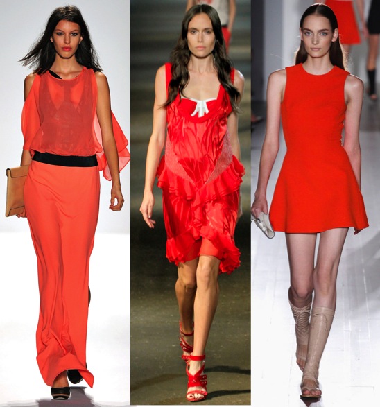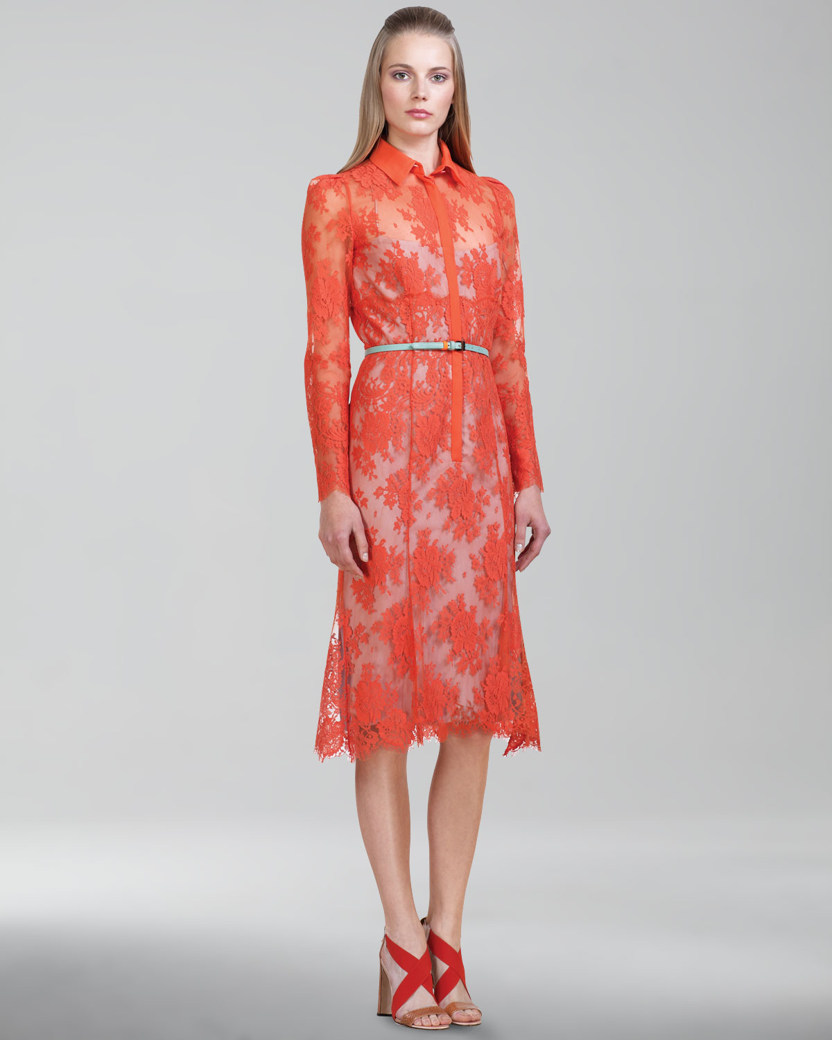 But this is no ordinary orange. Clementine or pumpkin are not the thing. Instead, it was up-notched to a punchy neon. See Max Azria, Prabal Gurung and Victoria Beckham here. Or Carolina Herrera. Or Lela Rose’s jigsaw lace dress.