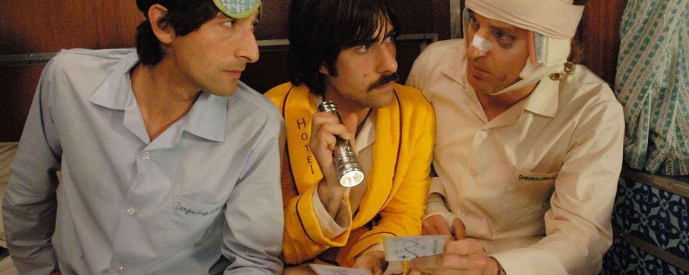 Poor sad Jack meets up with his brothers, poor sad Francis (Owen Wilson) and poor sad Peter (Adrien Brody) and they journey across India to reconcile with their mother. The brothers wear suits that have seen better days but their luggage is the Marc Jacobs for Louis Vuitton cases we first spied in Hotel Chevalier, and it's pretty damn spectacular.