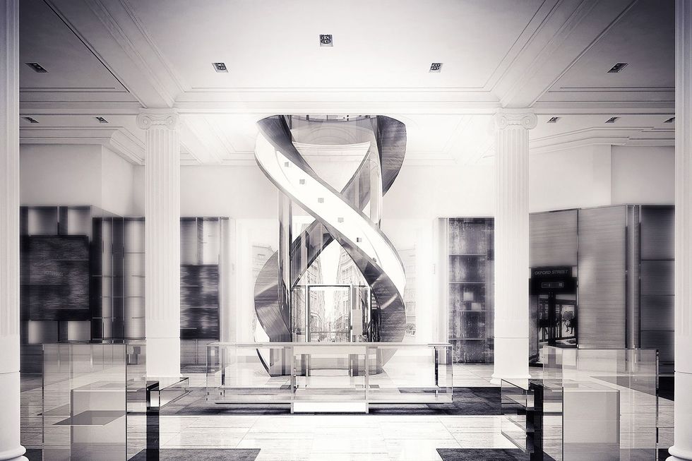 But back to the lift: created by architect Gwenaël Nicolas, it's a circular tubi affair, surrounded by a spiralling helix of lights in which Vuitton bags are proudly framed, and the capsule that swishes up and down inside revolves as it carries you upwards. It's a strange sensation, a bit like being a on the world's most glamorous theme park ride. The label calls this 'retail theatre', which fairly sums up the feel at this house: at once stately but also just a real laugh.